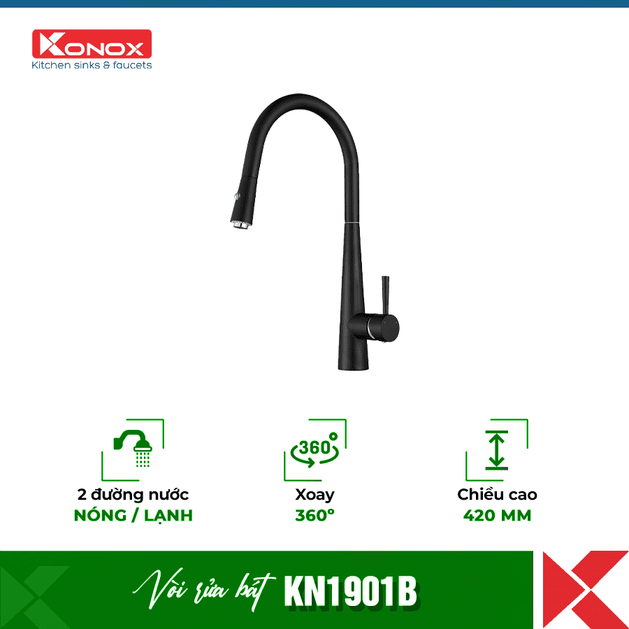 Yên tâm mua sắm Vòi rửa bát rút dây Konox KN1901B tại Bếp 365 – Showroom , đại lý chính hãng cao cấp nhất được chứng nhận của thương hiệu Konox tại Việt Nam , vận chuyển và lắp đặt toàn quốc.